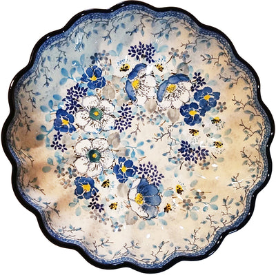This scallop-edged, blue and white serving bowl is Unikat (Signature), which means that it has been hand painted with both sponges and brushes and it is signed by the artist who painted it. Unikat pieces are the most involving works of art. Larger Unikat items take several hours of very careful work to finish.