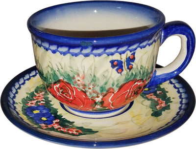 Boleslawiec Polish Pottery UNIKAT Cup and Saucer "Wild Roses"
