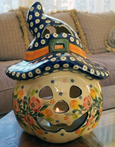 Boleslawiec Polish Pottery Halloween 13.5" Large Pumpkin Jack-O-Lantern Statuette Unikat "Garden Romance"